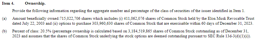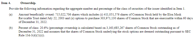 Although the filing shows on multiple lines that Musk beneficially owned over 715 million shares, the figures reference Item 4-Ownership. Item 4 indicates that only 411 million shares were owned outright while the remaining 304 million shares “beneficially owned” simply represent the options Musk currently has the right to exercise. The ownership disclosure for December 31, 2022, shows exactly the same number of shares beneficially owned, although the shares actually owned increased by 10,500 shares and the options decreased by the same amount, which obviously must have been due to 10,500 options being exercised during the year: