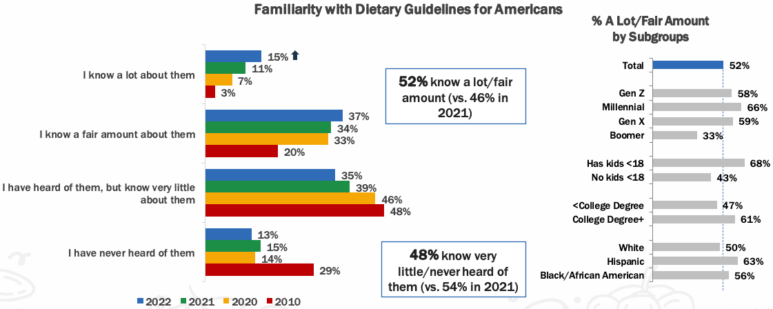 A survey conducted by the International Food Information Council in 2022 found that 52% of Americans follow a healthy diet or an eating pattern compared to just 38% in 2019. A record 52% of survey participants were familiar with dietary guidelines for Americans, up from the previous high of 46% in 2021. Younger generations, not surprisingly, proved to be the most knowledgeable of dietary guidelines.