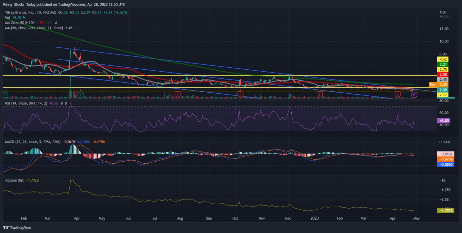 Looking at the daily chart, TLRY is trading in a downward channel and is below the 200, 50, and 21 MAs. Currently, TLRY is testing the 21 MA and upper trendline resistance which is a critical level for the stock. If TLRY is able to break this resistance, it could run to its next resistance near $2.75. However, if TLRY fails to break this resistance, it could drop near its all-time low of $2.18. Considering TLRY’s long-term potential if cannabis is federally legalized, I believe the stock would be a smart buy at current levels.