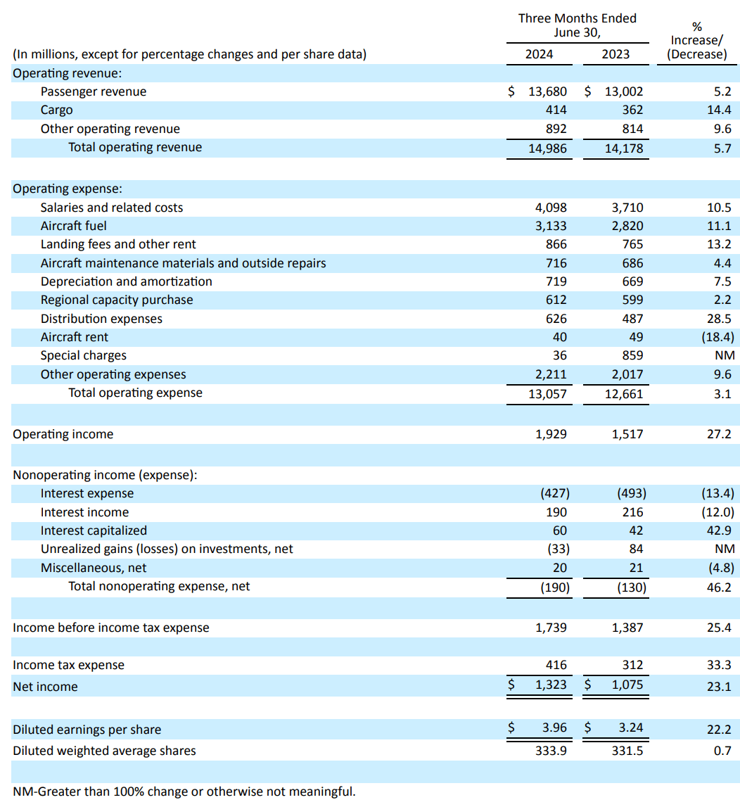 Total revenues grew 5.7% to $14.99 billion, beating analyst estimates by $20 million. Total operating expenses grew 3.1%, and against an 8.3% capacity growth that looks good. However, last year there was a special charge, and when we exclude this charge, the cost growth would be 10.3% higher and 10% higher when excluding fuel costs. So, revenue growth fell short of cost growth and capacity growth exceeded revenue growth but was lower than cost growth. So, you’re essentially looking at margin contraction. Adjusted operating margin fell from 16.8% to 13.1%.