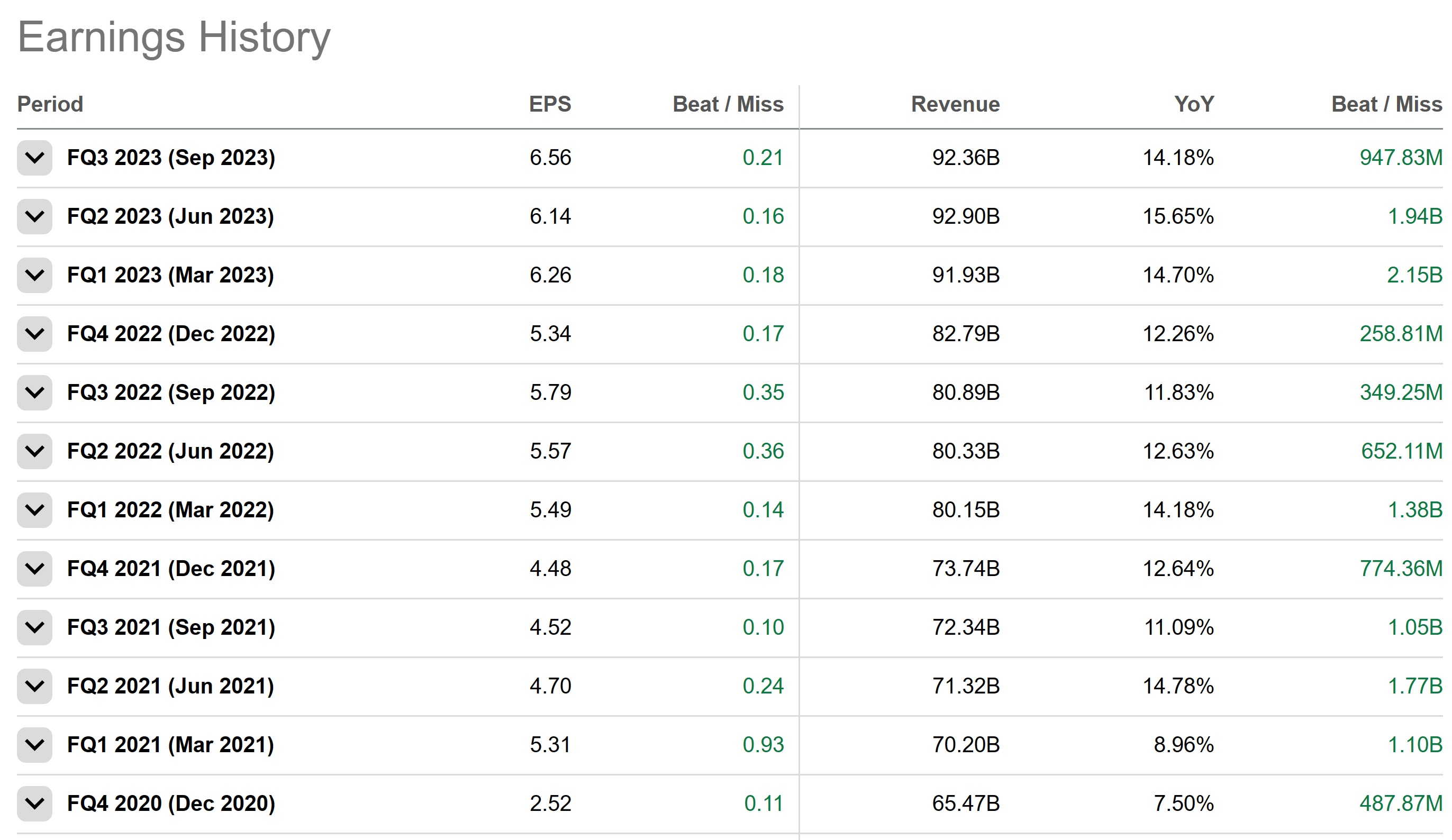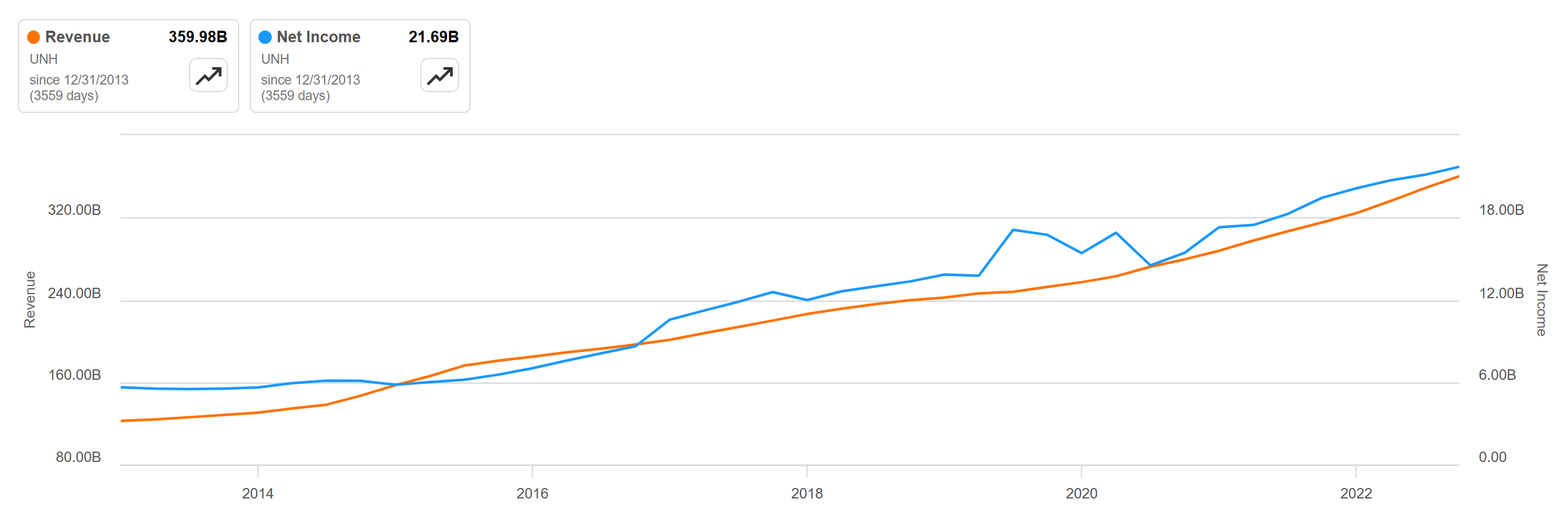 Zooming out, we can see that UNH has a long track record of beating on both the top and bottom lines, as shown below:
