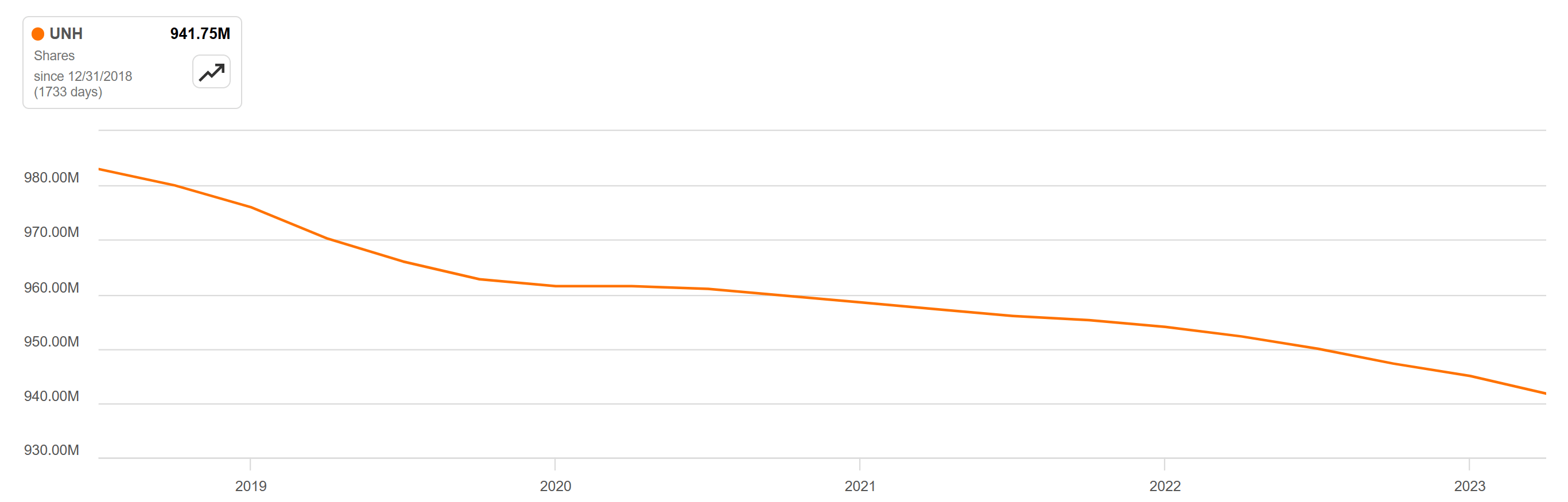 Thus, as demand for shares increases and the supply of those shares decreases, one would expect to see rising prices for UNH shares over time. This was true across the last decade, as the stock price went from $25 in 2010, to ~$490 by the end of 2021, earning investors a return of more than 1,400%: