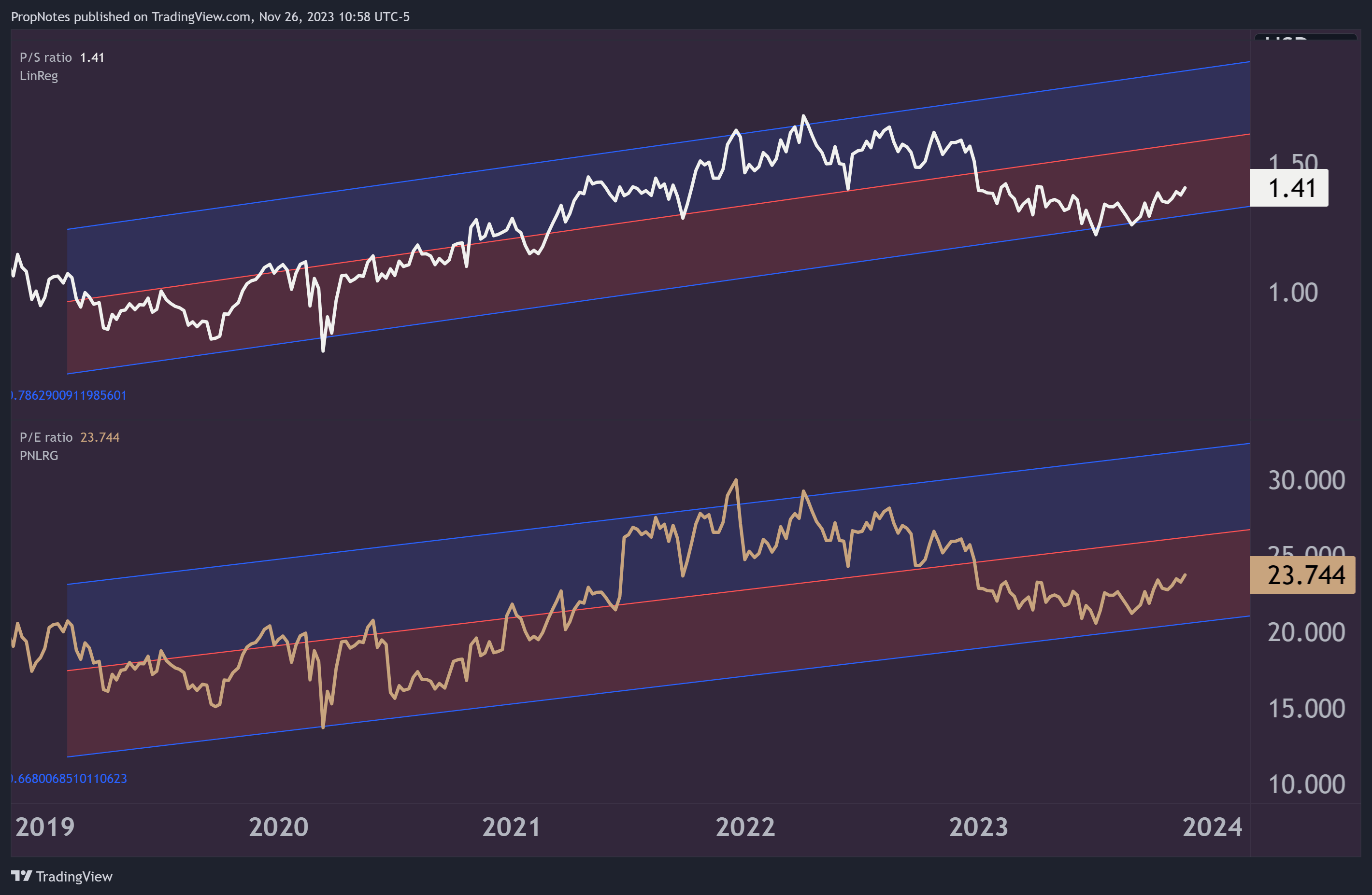 Historically, however, they represent quite a deal. When a linear regression and standard deviations are overlaid onto the valuation, one can see that the present multiples are at the lower end of the historical range.