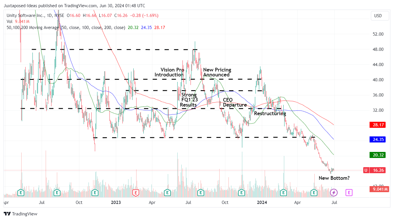 - U’s prospects remain highly speculative going into FQ2’24 earnings call in August 2024, as the stock continues to lose much of its value.