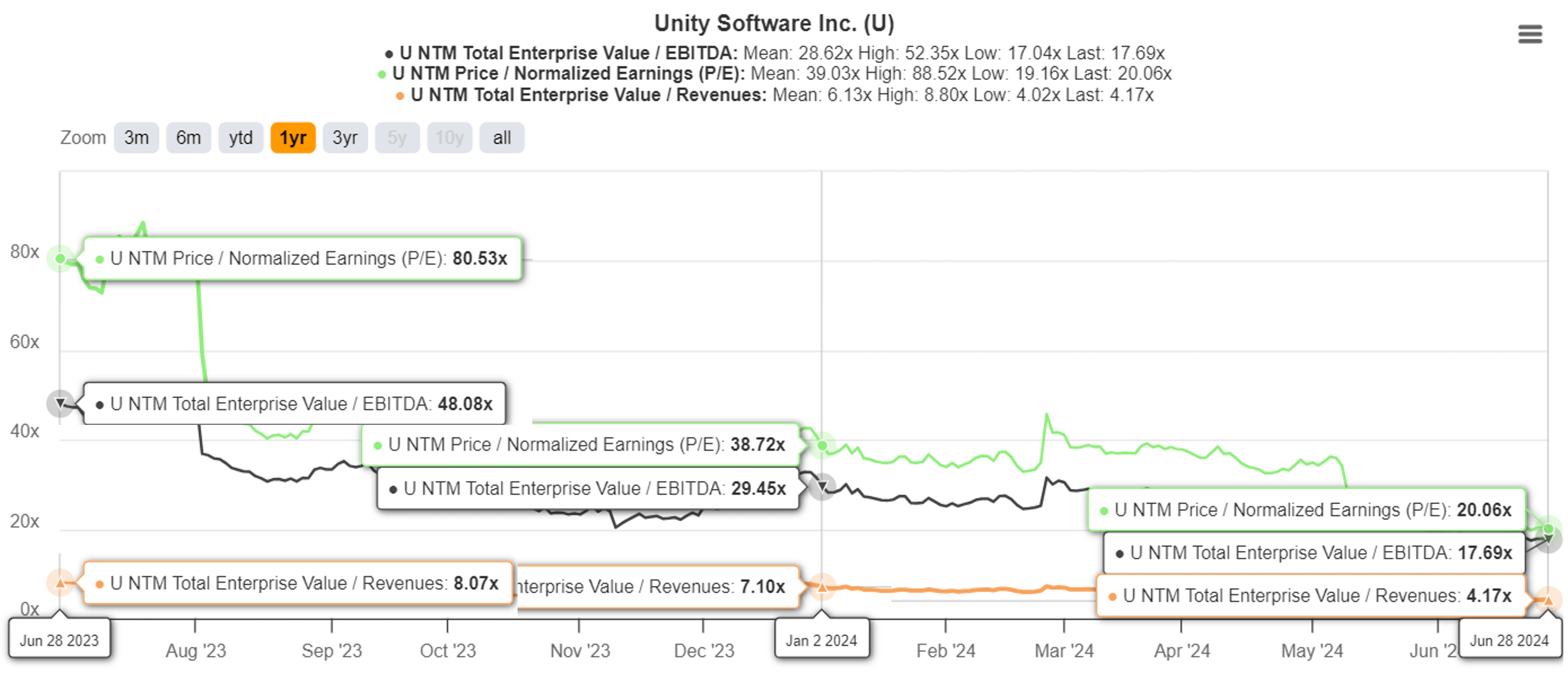 While it is uncertain if the new CEO may be successful, we believe that it allows U to re-start on a clean slate, significantly aided by the correction observed in its stock valuations and prices, to be discussed in the next section.