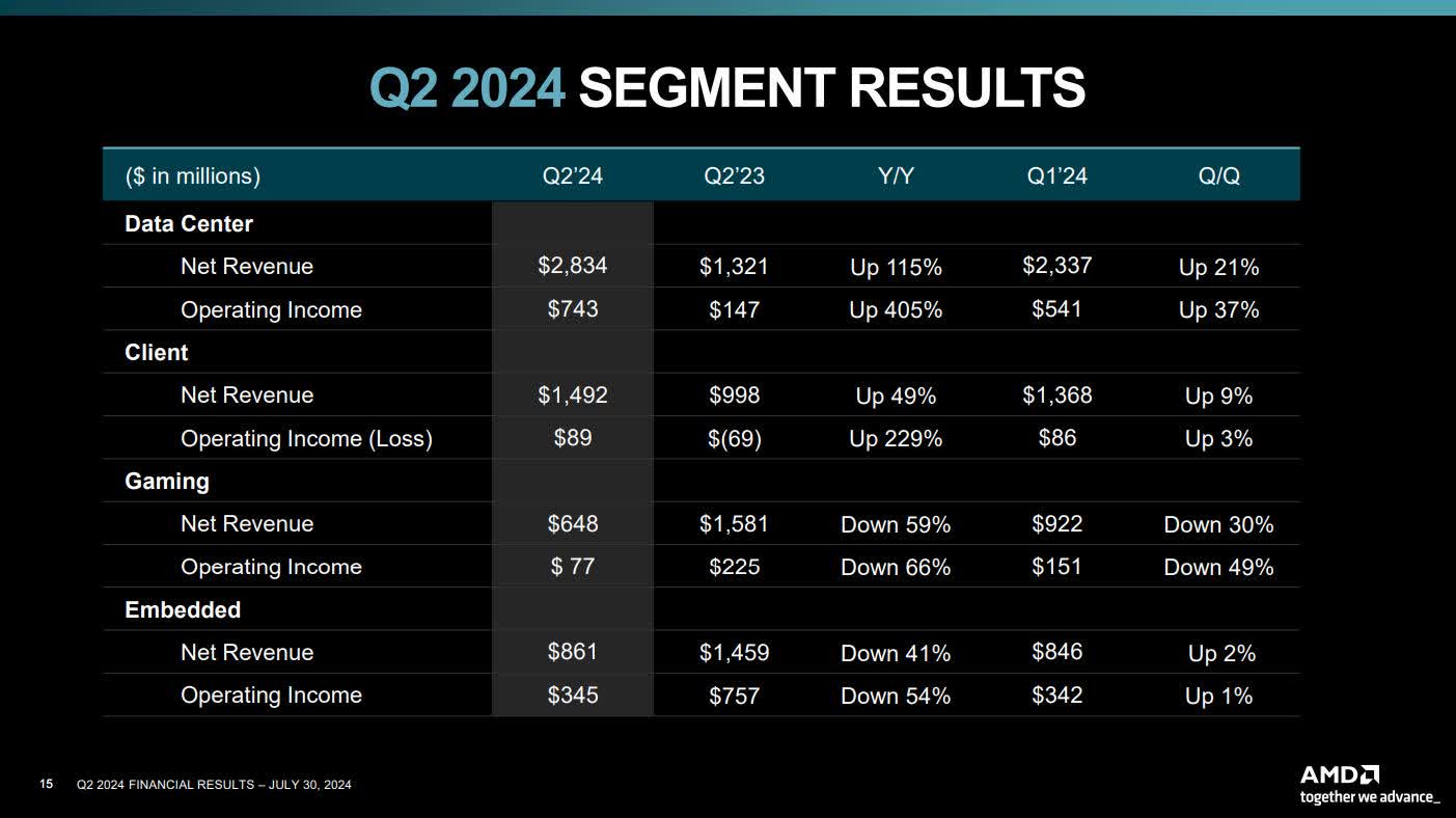 AMD’s second-quarter 2024 Data Center segment operating income margin rose 15.1 points to 26.2% year over year. Data Center Operating income was up 405%.