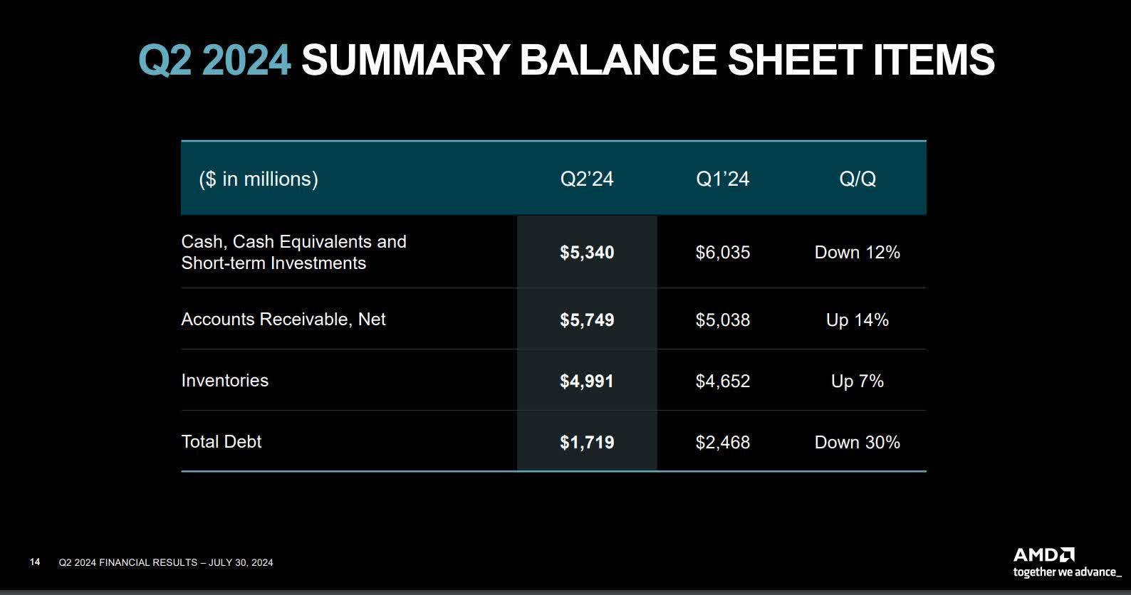 The company’s second-quarter 2024 non-GAAP operating income rose $190 million year over year to $1.3 billion. In the second quarter, the non-GAAP operating margin was up 2 points to 22% compared to the previous year’s comparable quarter. Operating expenses/revenue was up 2 points year over year to 32%, meaning the company is investing more to produce revenue growth. Still, revenue growth and gross profits outpaced rising operating expenses during the quarter. Investors should monitor how long management can maintain that scenario, since competition remains fierce. AMD may need to increase investments in research and development (R&D) to keep pace with Nvidia in AI chips, possibly hurting operating margins in the future.