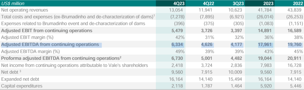 Vale presented good numbers in 4Q23, driven by strong operational progress, as there was a recovery in volumes in ferrous minerals, copper, and by the higher average prices realized for iron ore in the period, which resulted in an increase of 36% y/y in adjusted EBITDA, which reached $6.3 billion. Along with the release of the results, Vale announced the approval of the distribution of $2.4 billion in dividends.