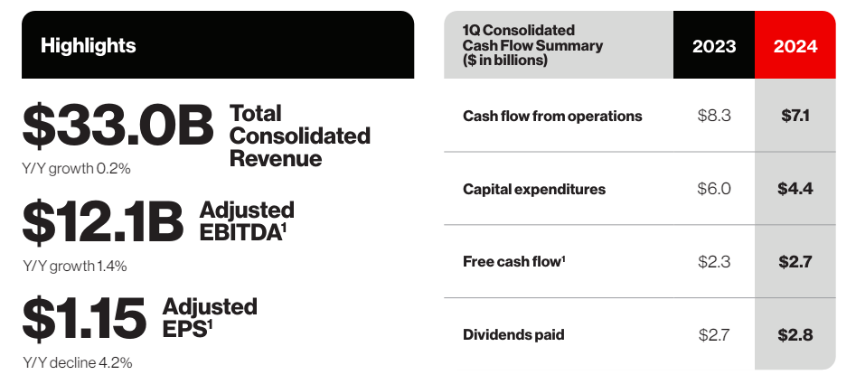 - Verizon’s Q1 performance showed positive trends, including a positive EPS surprise and a 1.4% growth in non-GAAP EBITDA.