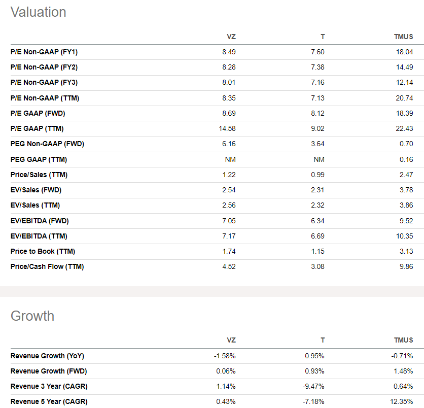 As it is widely known, there are three major telecom players in the U.S.: Verizon, AT&T and T-Mobile. Therefore, I want to start my valuation analysis by comparing VZ’s ratios to its closest peers.