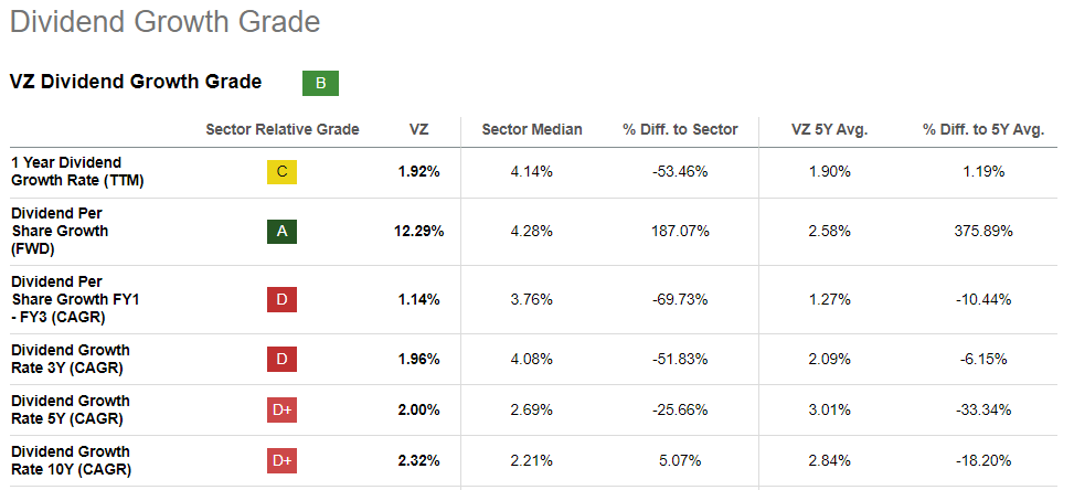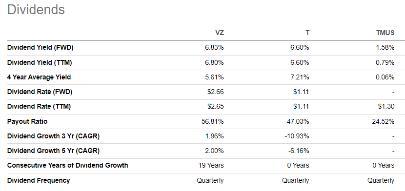 - Verizon’s dividend yield and growth record are the best-in-class among the three largest U.S. telecom players.
