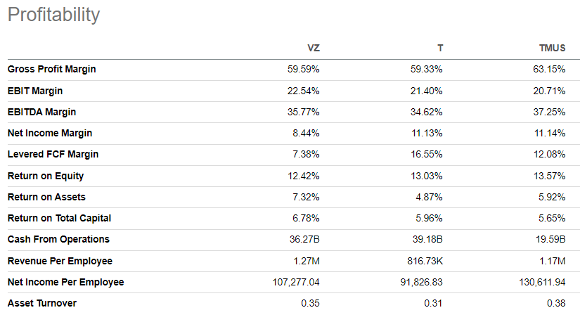 The management’s holistic approach to develop both the top and bottom lines can be seen by its better than competitors’ ROE and ROA metrics, which reflect the efficiency of assets and capital employed. I would also like to emphasize that VZ has strong per employee metrics, meaning that the company efficiently manages its headcount.