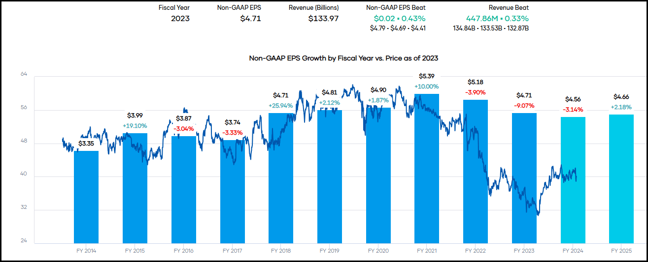 Earnings are expected to be weaker again this year, though moderate from the declines seen in fiscal 2023. Analysts are projecting earnings growth to return once again in fiscal 2025. If they can achieve that, it should only further support the share price fundamentally for the long-term investor. After two years of declines and an expected third year of declines, that would admittedly be refreshing to see.