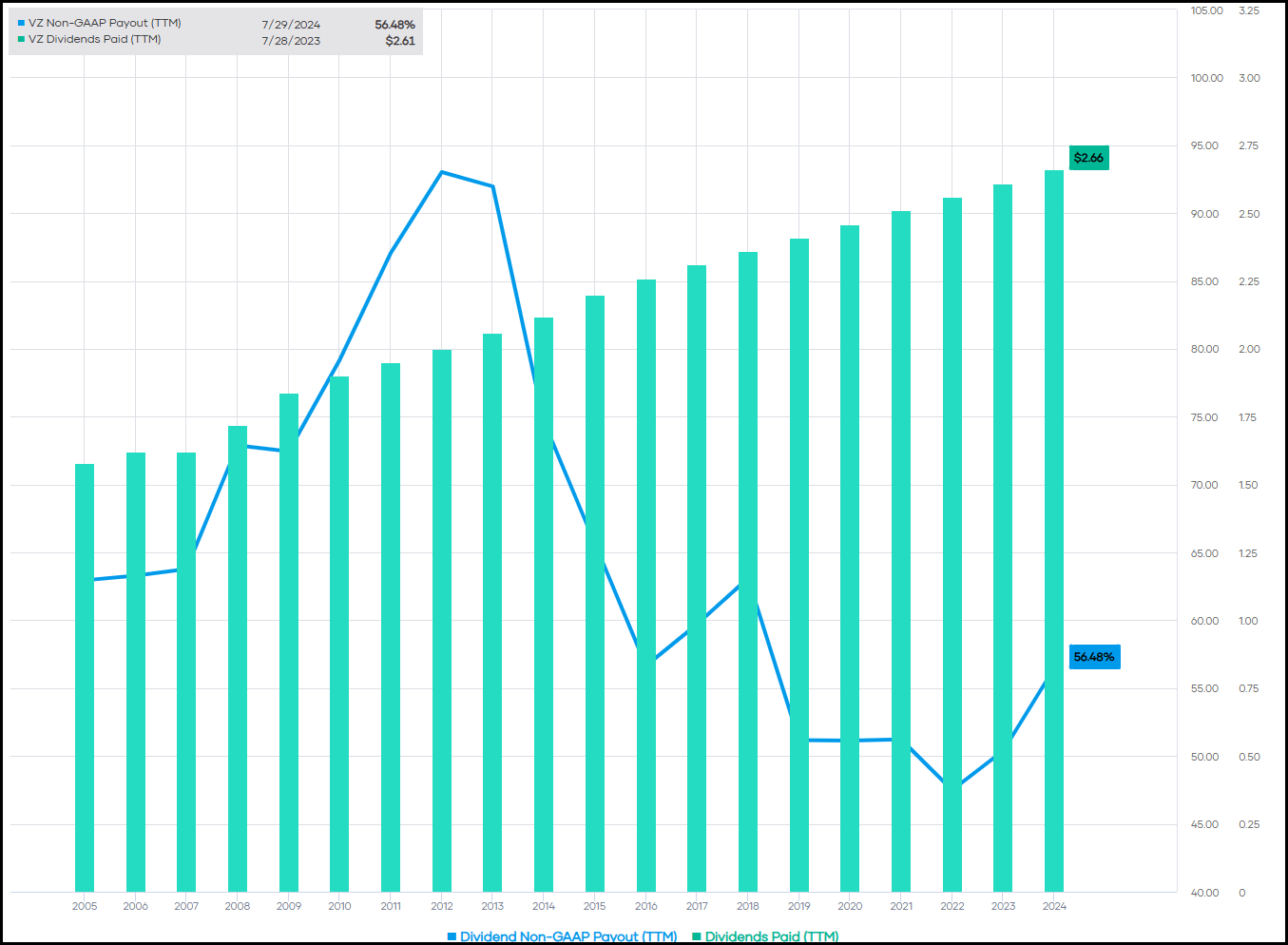 On the payout ratio front, VZ is looking quite healthy. The latest EPS came in at $1.15; against the current $0.665 per quarter, we are looking at a payout ratio of around 58%. That’s up modestly from the last few years but down relative to the longer-term payout ratio.