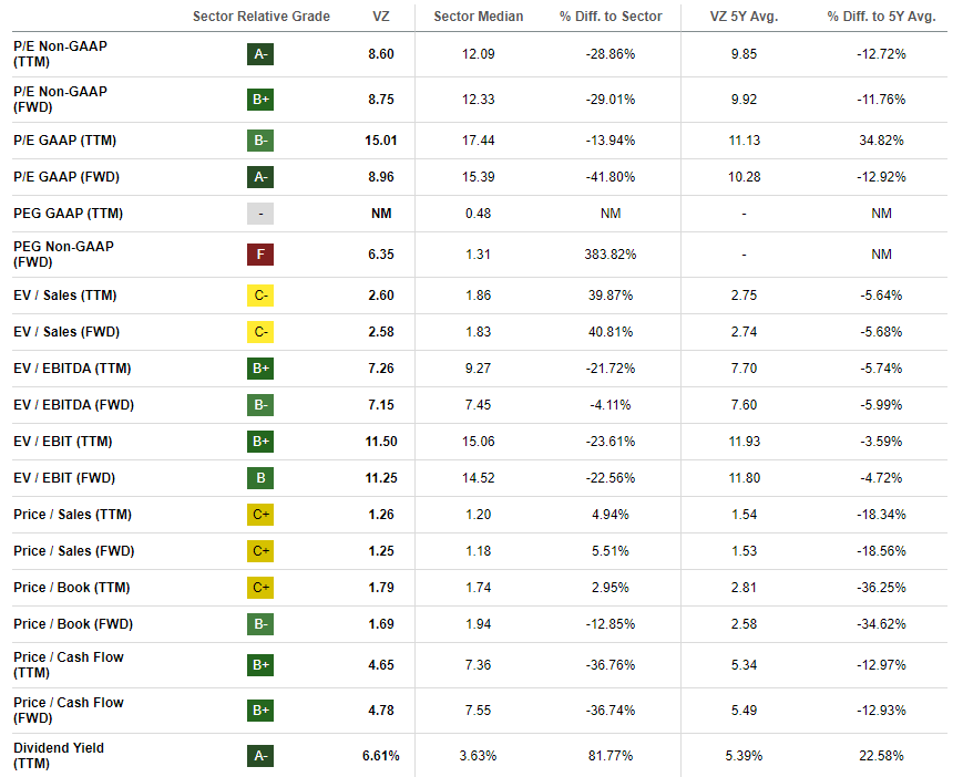 The stock price increased by 11.9% over the last twelve months, notably lagging behind the broader market. YTD performance was also behind the S&P 500 with a 6.3% rally. Verizon’s current valuation ratios are mostly lower than historical averages, meaning that the stock is attractively undervalued from the multiples perspective.