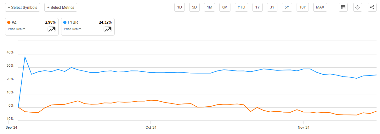 Frontier is up nearly 25% since the deal announcement, while Verizon is down.
