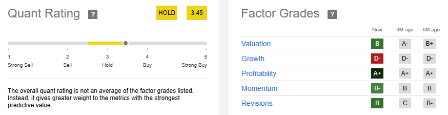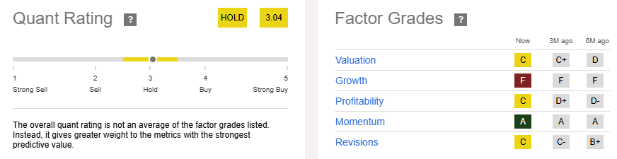 The quant rating is also signaling a hold, driven down by Verizon’s growth challenges as of late, offset partially by a strong profitability rating.