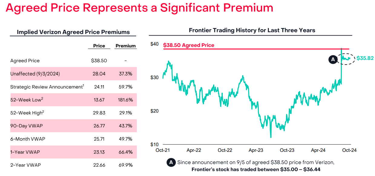 On September 5th, 2024, Verizon announced an offer to acquire Frontier Communications in a cash offer of $38.50 per share. The deal would close in approximately March 2026 pending regulatory approval.