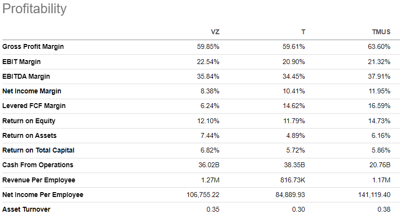 The management’s holistic approach to developing both the top and bottom lines can be seen by its better than competitors’ ROA and return on total capital metrics, which reflect the efficiency of assets and capital employed. I would also like to emphasize that VZ has strong per employee metrics compared to rivals, meaning that the company efficiently manages its headcount.