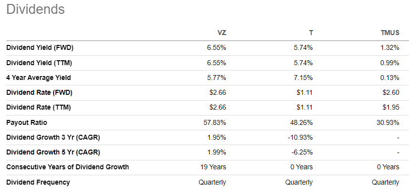 - Verizon’s dividend yield and growth record are the best-in-class among the three largest U.S. telecom players.