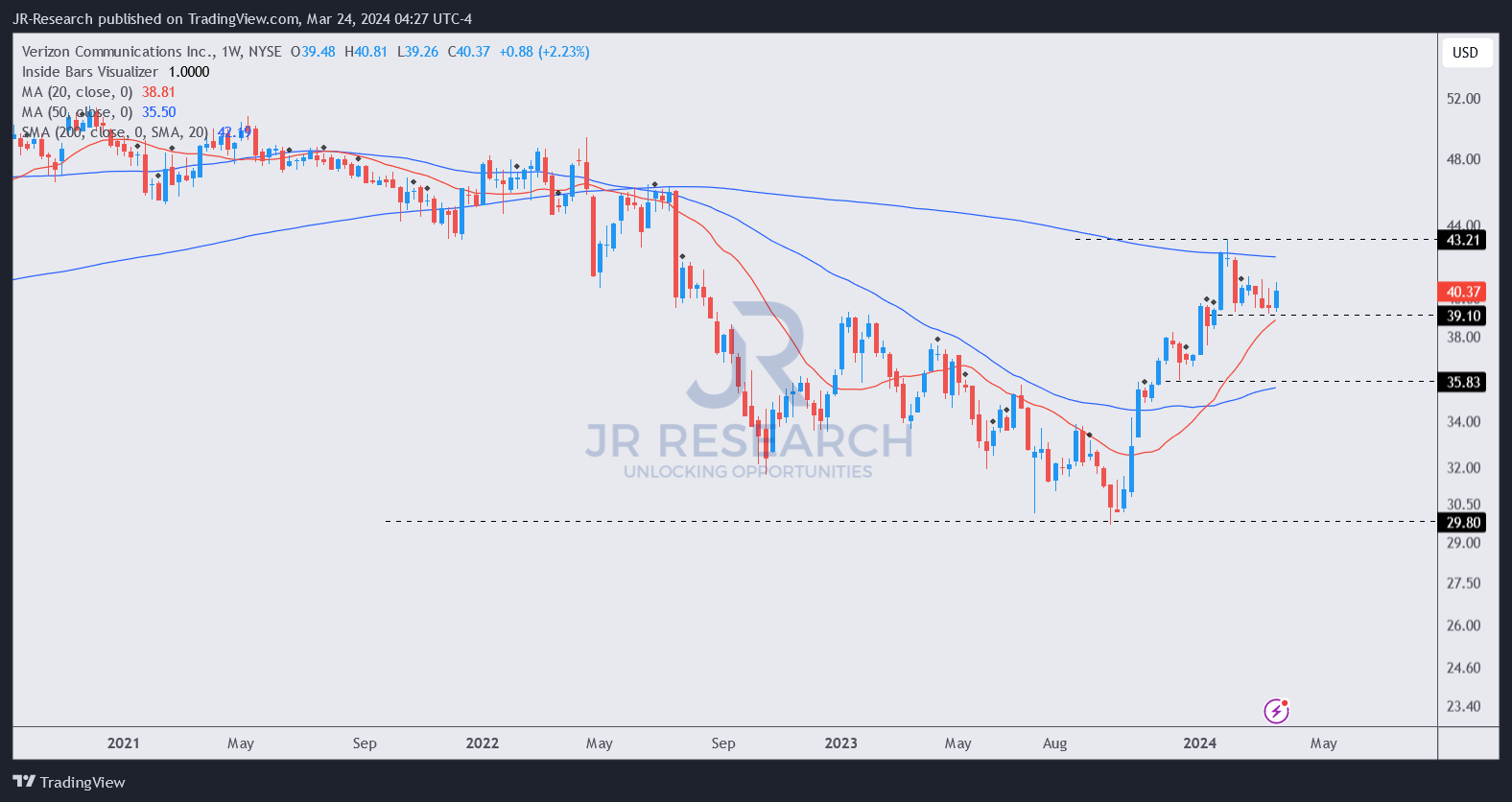 - With VZ consolidating at the $40 level, buyers should consider buying before it potentially surges higher.