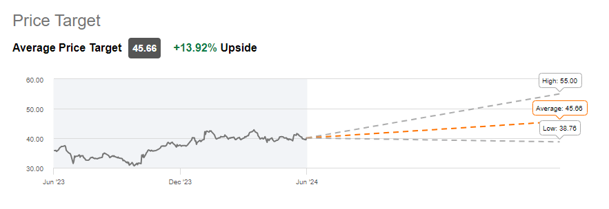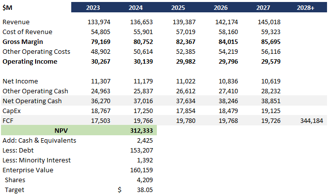 This DCF analysis yields a price target of $38.05, a slight downside from today’s pricing, although still generating a generous dividend.