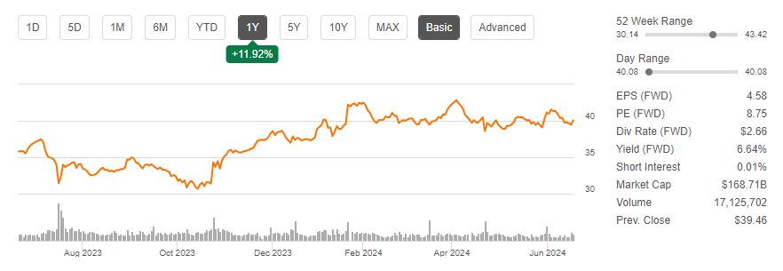 Verizon is down significantly from its historical high 50s, low 60s performance, although there has been a slight uptick over the last six months. The 6%+ dividend yield continues to be the value driver for the stock.