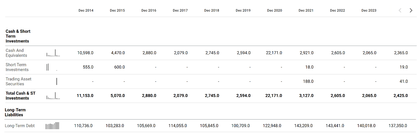 Finally, I need to articulate the risks to my thesis. First and foremost, trading options are more complicated than trading shares directly. As a seller of call options, my gain is limited, but my loss can be unlimited. Secondly, there could be some upside risks in VZ’s business fundamentals too. The capital expenditure (especially for the 5G build out) could have passed its peak already (see the next chart below), thus giving the company more capital allocation flexibility (e.g., to grow dividends). Second, the company has been stabilizing its debt and even paring it recently (see the balance sheet of the second chart below). Notably, its cash position has become stronger (currently at $2.4B compared to about $2.0 billion in December 2023), and its long-term has decreased to the current level of debt of $137 billion (as compared to $141 billion by the end of 2023). However, the effect of the debt reduction was offset by higher borrowing interests and its profitability headings, as you can see from the interest coverage shown in the last chart.