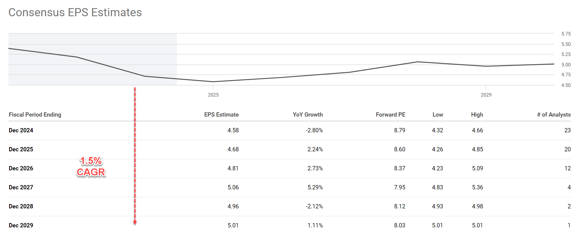 Looking ahead, the growth picture is quite uninspiring too. The next chart below shows the consensus EPS estimates for VZ in the next six years. The chart shows that analysts expect VZ’s EPS to fluctuate YOY in the next few years with an overall CAGR (compound annual growth rate) of only 1.5%. I indeed see many uncertainties for its growth and believe such a tepid projection is very plausible. The top two uncertainties on my list include the competition in its consumer segment and the decline of its wireline segment.