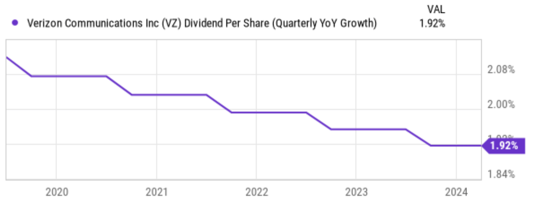 I firmly believe that valuation and dividend yield have to be always interpreted in the context of growth. I see a very tepid growth curve for VZ ahead as reflected in the dividend growth rate in recent years. As you can see from the chart below, the dividend growth rates have been slowing down to the current level of 1.92%. For our income account, I see other options with similar yield (or even higher yield), similar P/E, with much better growth prospects (Enterprise Products Partners, EPD, is a good example that comes to mind).