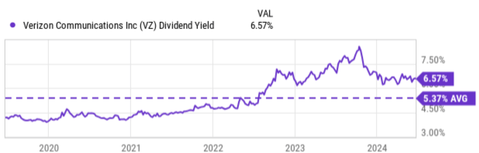 Of course, there are still plenty of good reasons to like the stock under current conditions, and the prevailing sentiments are indeed quite strong as you can see from the chart below. Over the last 90 days, 26 Wall Street analysts offered ratings on VZ, with an average rating of 3.76, translating into a solid “Buy” rating. Notably, seven of them (i.e., close to a quarter of them) rated the stock as a “Strong Buy.” Seeking Alpha writers gave VZ an even stronger rating with an average score of 4.2 as seen. A few factors are behind such bullish sentiment. First, the current yield of 6.6% is still attractive both in absolute and relative terms. For example, it’s significantly above its five-year average of 5.37% as seen in the second chart below. Second, as a sector leader trading at a single-digit P/E, VZ offers a textbook value opportunity. Lastly, there are some growth prospects too considering the rollout of 5G.