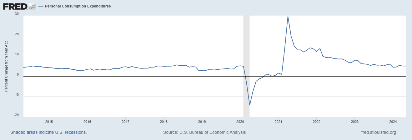 To an extent, these sustained high expectations about Visa’s revenue growth have come as a result of the resilient global economy in the first half of 2024. For example, the U.S. consumer remained healthy over the period, with year-on-year growth in personal consumption expenditures remaining at around 5%.