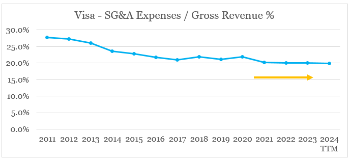 In recent years, I have also been emphasizing the limiting factor of Visa’s enormous size on its margins, as economies of scale seem to have been exhausted when it comes to fixed costs. As we see on the graph below, in the 2011-2017 period, Visa has expanded its operating profitability as it grew in size and fixed costs as a share of revenue fell. This, however, is no longer the case and a reason why margins have peaked.