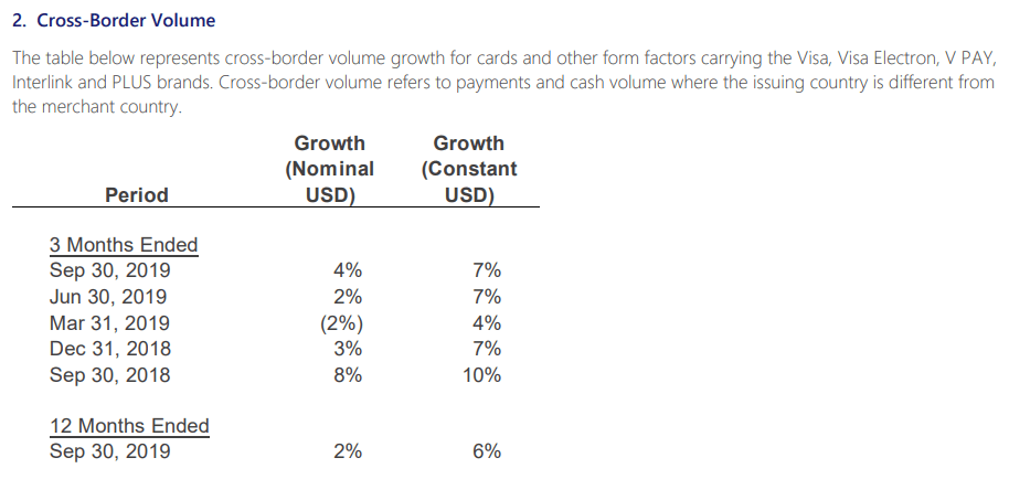 (…) we are making a small adjustment to our outlook for total payments volume growth to the high-single-digits from the low-double-digits. Total cross-border volume, excluding Intra-Europe is expected to continue to grow strongly in the mid-teens with the strength in e-commerce generally offsetting weakness in Asia travel.