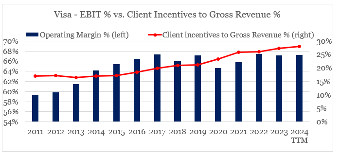 Another major reason why Visa’s stock price is unlikely to outperform the equity market going forward is the fact that operating margins have peaked in recent years at around 67%, while client incentives have been increasing as a share of gross revenue.