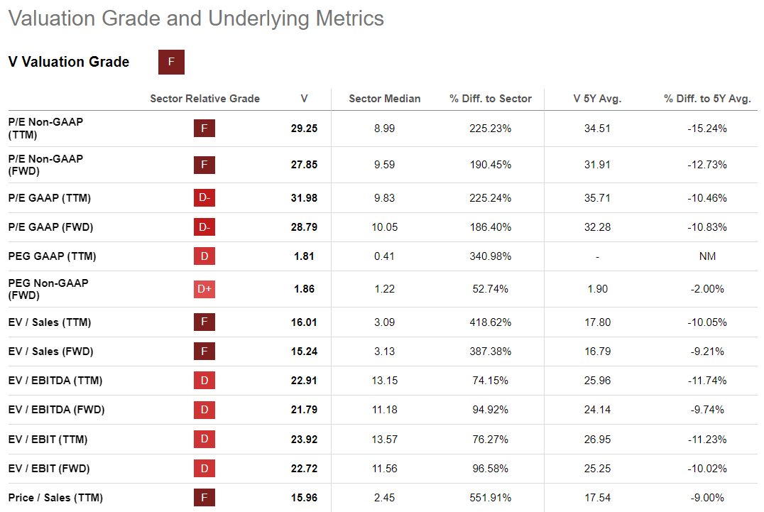 The Seeking Alpha Quant rating system is currently rating Visa with a valuation grade of “F”, suggesting the company is heavily overvalued. While the valuation metric here on Seeking Alpha is always a good first indication, I think SA is wrong here, since they compare Visa to the whole Financials sector and therefore to general cheaper companies like banks etc.