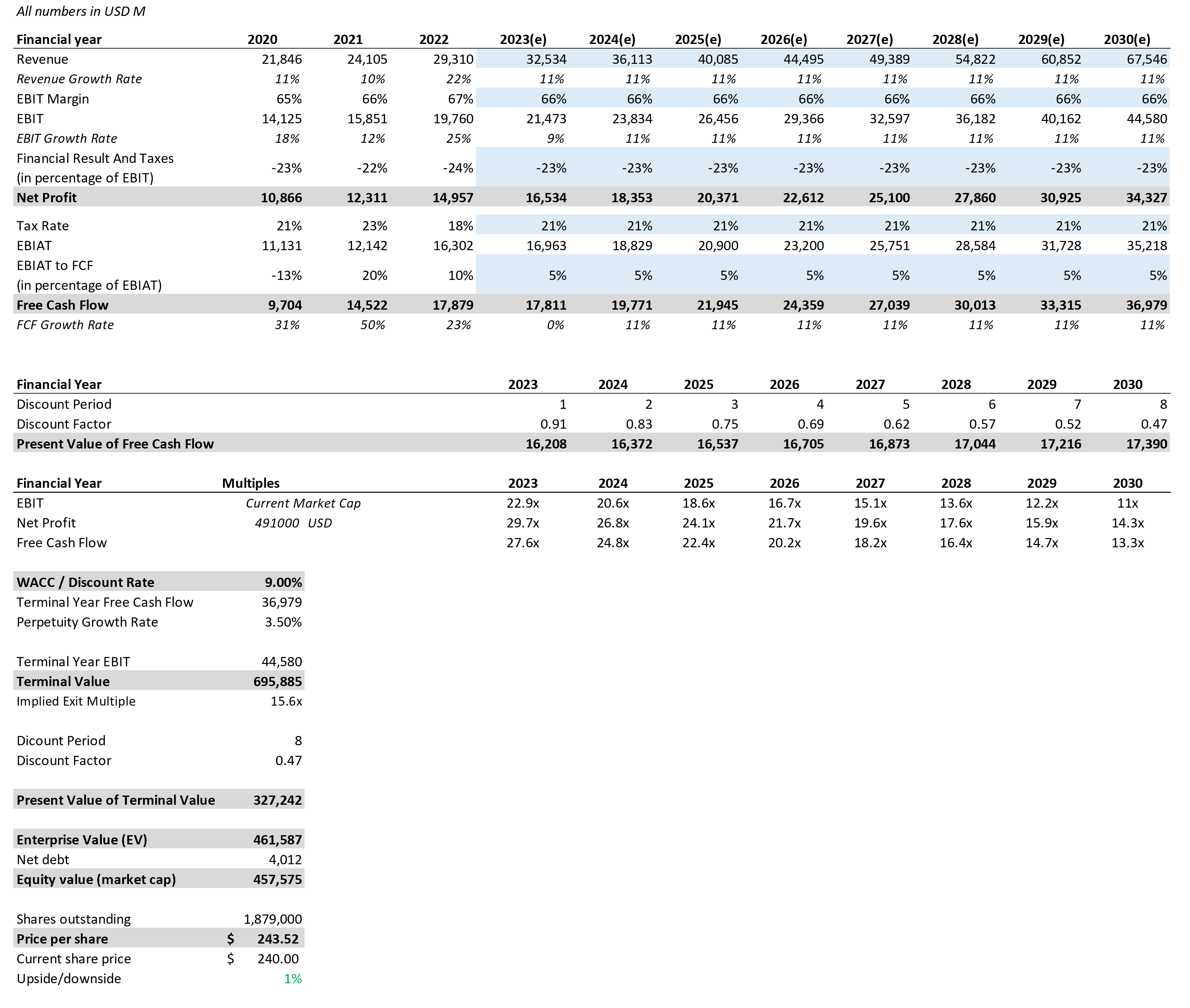Based on our reasonable conservative Discounted Cash Flow analysis, we arrive at a price target of $243, which indicates the company is pretty much trading at a fair valuation going into earnings.