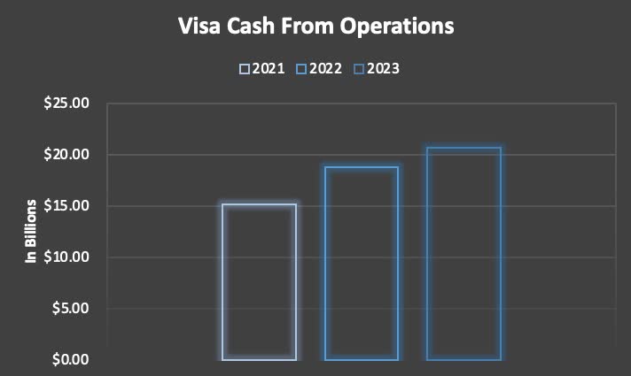 Despite the macro environment, Visa has performed exceptionally well, growing payment volumes and cash from operations. Additionally, they continued to increase and renew partnerships, giving the company access to millions of additional users and this will only benefit them going forward. Although growth is expected to slow this year, I still expect their share price to continue growing, especially if interest rates do decline.
