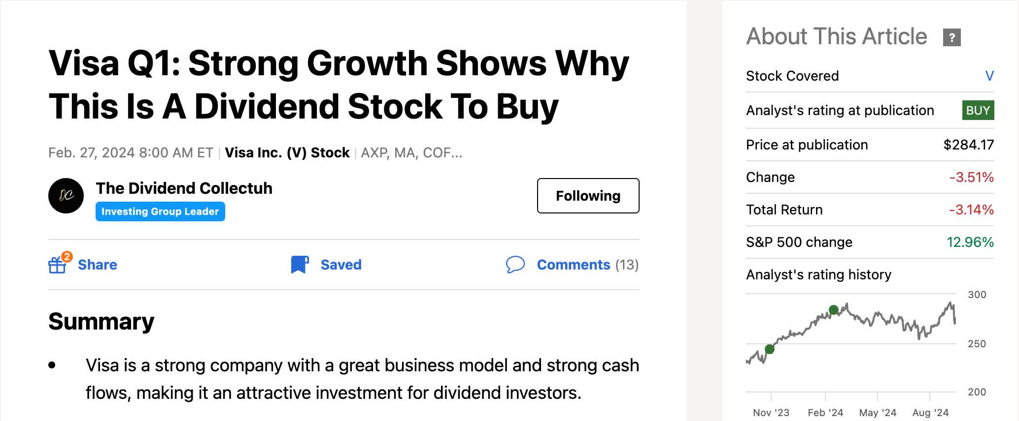Visa was trading at $284 at that time, but due to headwinds from the DOJ, which Ill touch more on later, their share price has shown some weakness recently.