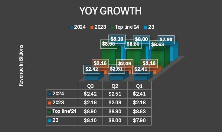 Revenue almost saw near double-digit growth as well, up 9.7% from $24 billion to $26.33 billion through three. In the chart below you can see the company’s EPS & revenue they brought in during each quarter in comparison to the previous year.