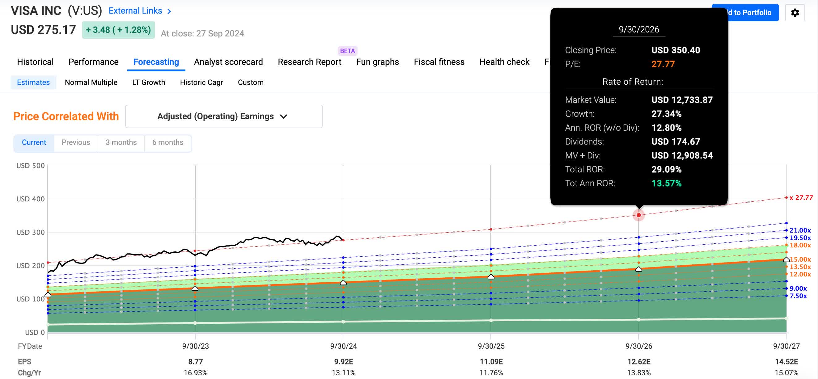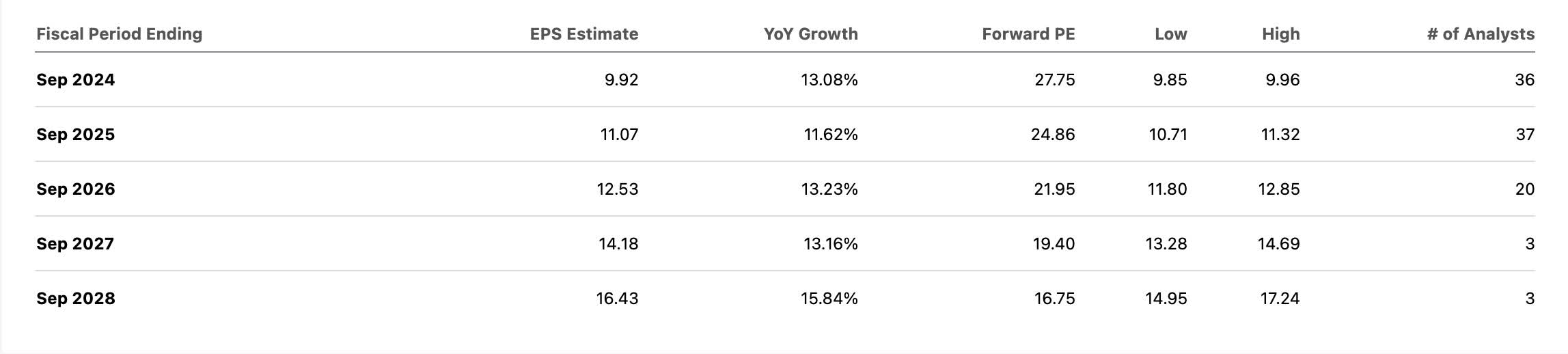 Year-over-year through three quarters Visa’s performance has been even better with earnings up double-digits at more than 14%. This stood at $7.34 vs $6.43 through three in 2023.