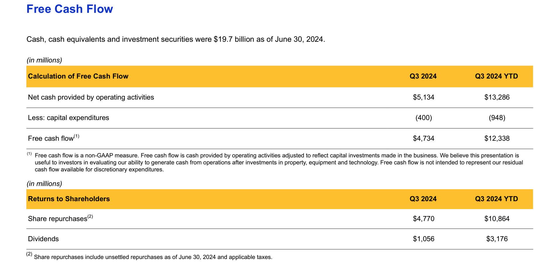 So far Visa has brought in $12.338 billion in free cash flow and paid $3.176 billion in dividends, giving the company ample room for double-digit increases that are likely to continue for the foreseeable future.