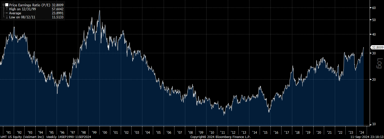 - Walmart’s PE ratio has surged to 33x, its highest since 2002, while the rise in capex has seen the price-to-free cash flow ratio rise above 50x.