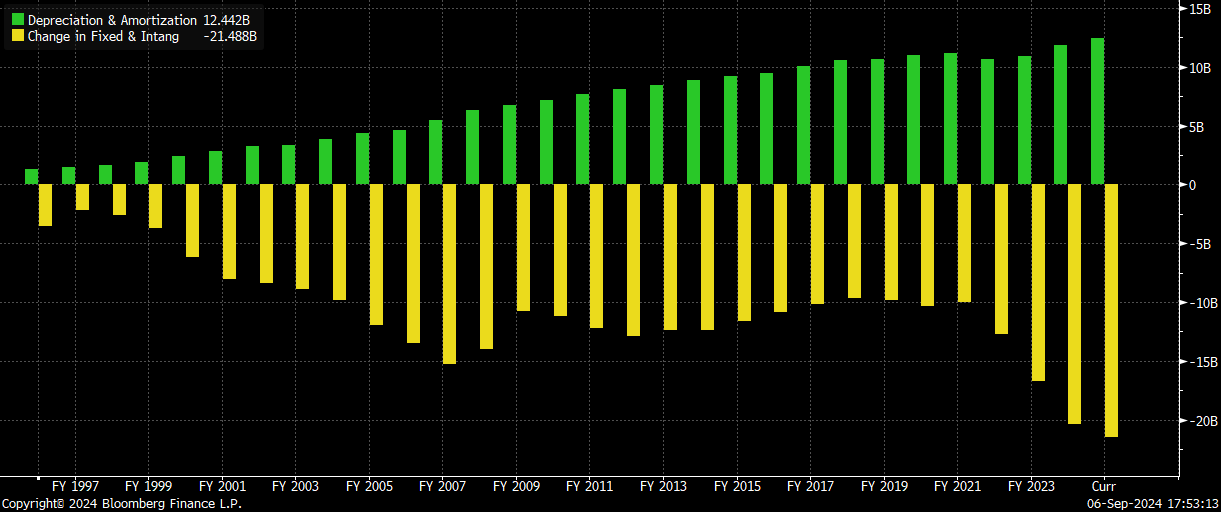 Walmart (NYSE:WMT) has seen its share price surge over recent years, making it one of the best performing US mega cap stocks. However, in contrast to many other companies, Walmart’s earnings growth has been poor, which has driven Walmart’s PE ratio to 33x, its highest multiple since 2002 and a 65% premium to the average S&P 500 stock. Even this lofty figure understates the true multiples that investors are paying for the stock today, as capex has surged relative to depreciation. On a price to free cash flow basis, the earnings multiple rises to above 50x. The earnings growth required to justify current valuations is highly unlikely to be achieved given the company’s already huge scale.