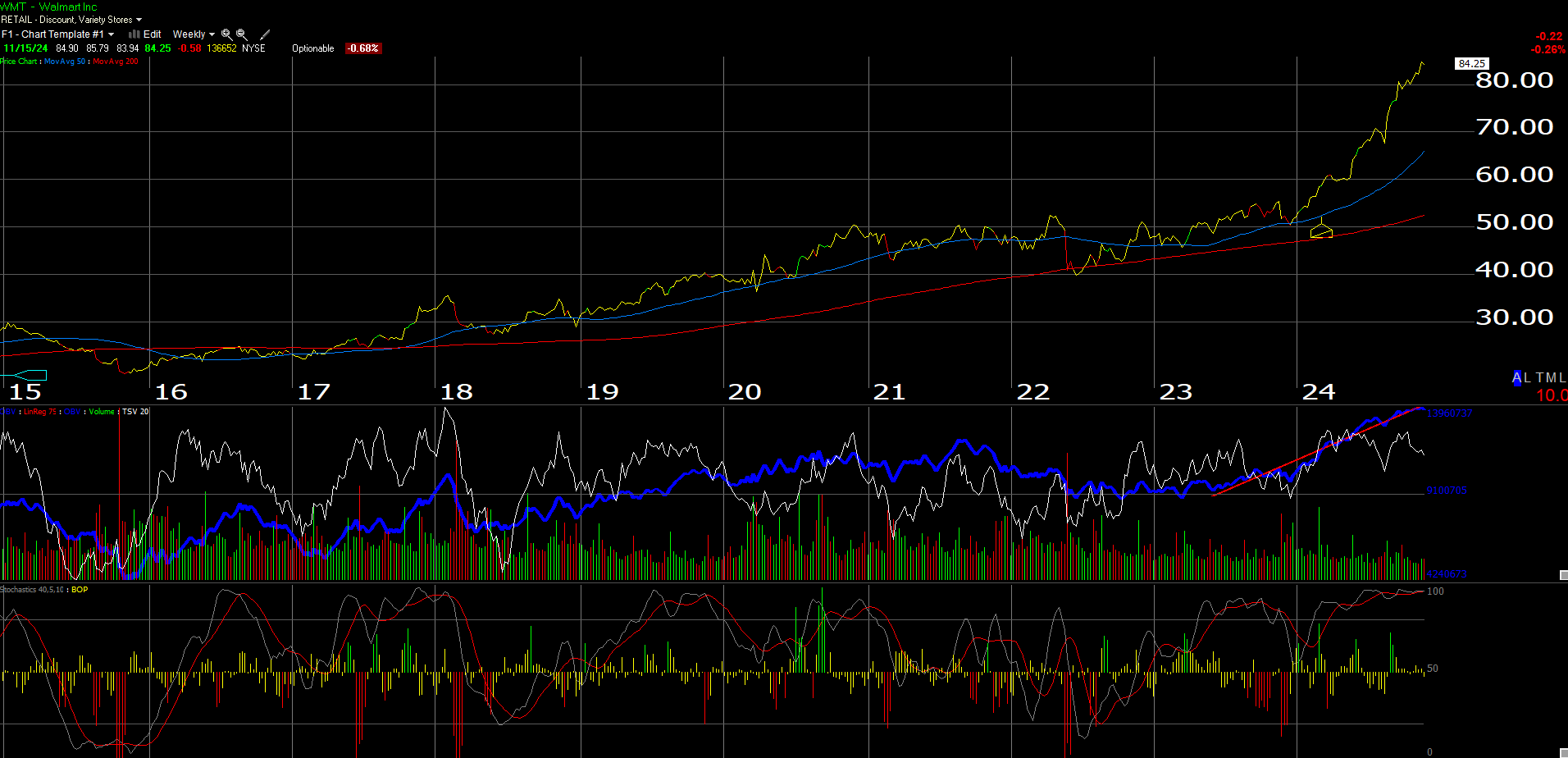 Here’s the weekly Walmart chart showing the stock’s 61% YTD return as of 11/15/24: