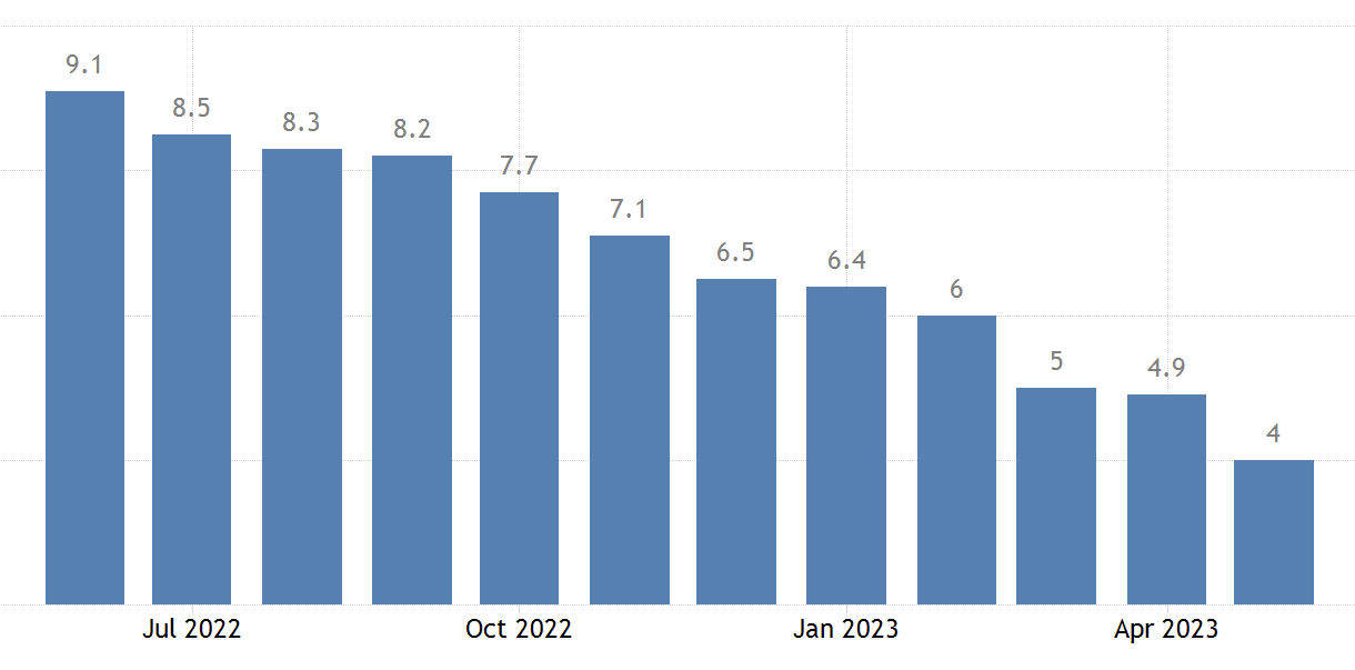 Thanks to soaring inflation, Walmart was able to raise prices significantly in the past two years. In many cases, the increase was even higher than the inflation rate, as the company leveraged its strong branding and customer loyalty. This also benefited margins as most incremental revenue flows directly to the bottom line. However, this tailwind is now fading as inflation continues to decline rapidly. As shown in the chart below, the US CPI (consumer price index) dropped from 9.1% in June last year to just 4% in May.