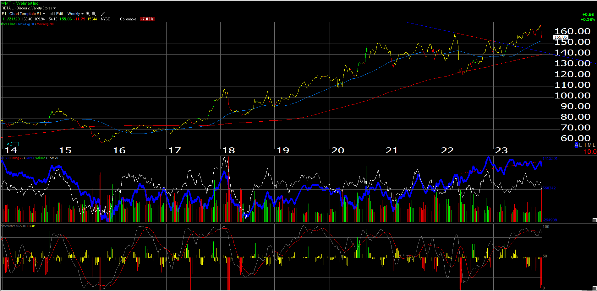 Here’s Walmart’s weekly chart as of today’s (11/21/23) close, with the stock bouncing off its 200-day moving average (not shown) and ending the day higher on heavier volume.