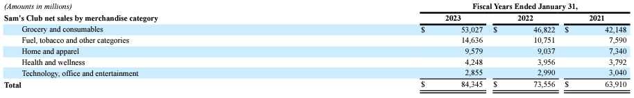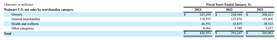 In the US, grocery sales make up about 60% of WMT’s revenue, offering stability during economic slumps. Furthermore, the grocery sector has been expanding more rapidly than other business segments. From 2019 to 2023, the annual growth rate for groceries was 8.4%, compared to 6.7% for the rest of the business. Since the last recession, the grocery segment’s share of WMT’s total business increased from approximately 49% in 2009 to 59.5% in 2023.