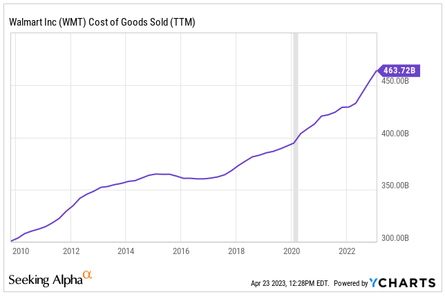 WMT’s magnitude and scope generate a formidable competitive edge, allowing WMT to capitalize on its buying power, supply chain, and distribution capacities. From 2009, the cost base has grown by 54% to $464 billion, augmenting WMT’s negotiating power with suppliers.