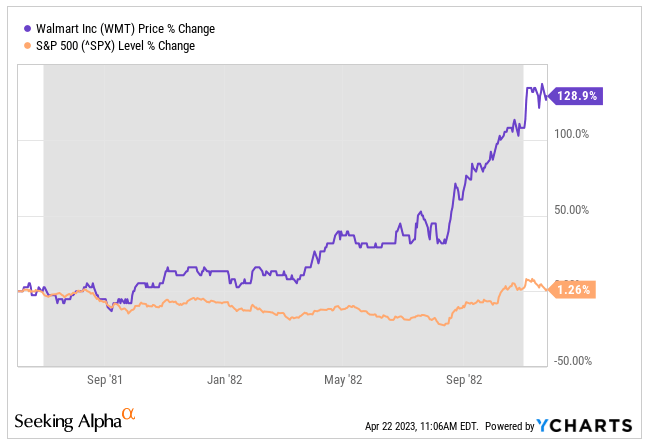 Even during the recessions of the 80s and 90s, WMT stock rose by 130% and 33% while the S&P gained 1% and 3% respectively.